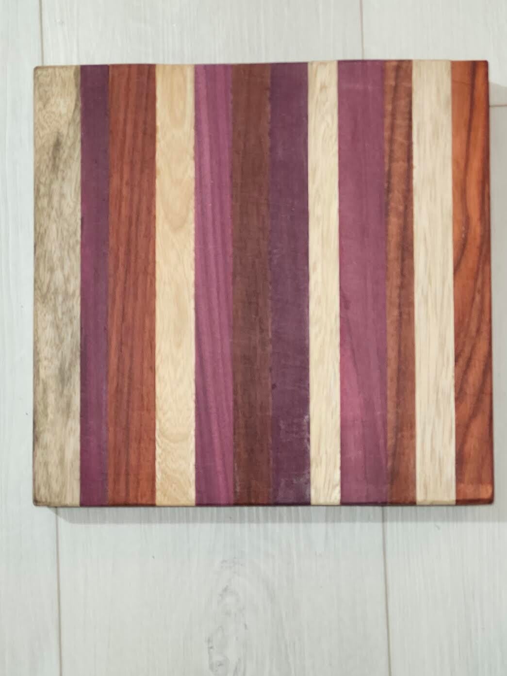 Hardwood cutting board with dimensions 12 in x 12 in. Several different species of wood are used in this board. It also comes with mini-legs for stability and will make a gorgeous addition to any kitchen.
