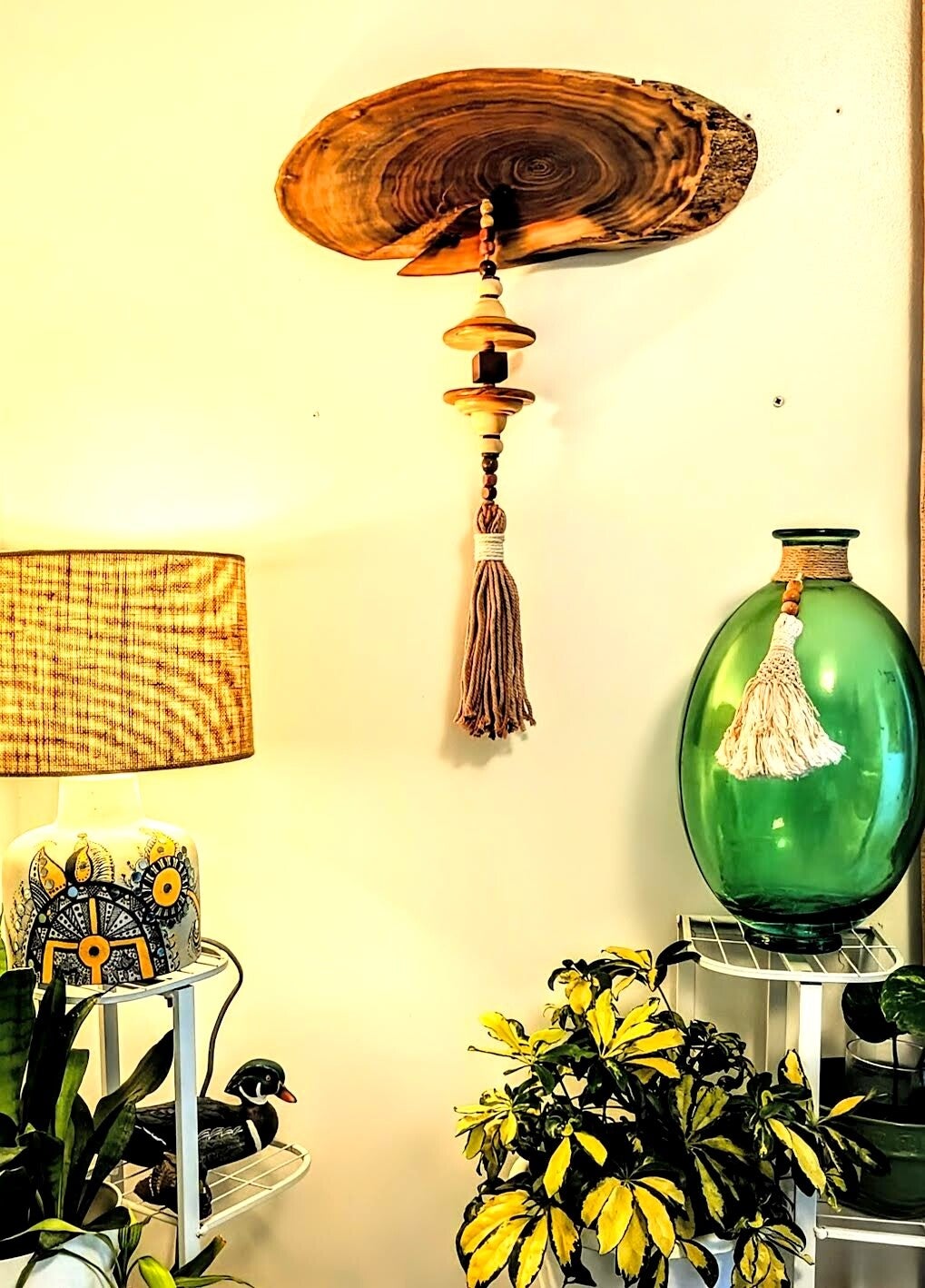 Natural live edge treated wood displaying various earth-tone macrame tassles. Dimensions: 21 inches wide, 28 inches long. It's ready to be hung in your home and also makes a very lovely gift for the important people in your life.