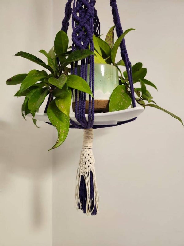 This beautiful plant hanger features purple macrame with white macrame accents. It hangs down 44 inches from the top and can hold at least a 6 inch pot, (not included). Makes a thoughtful holiday or housewarming gift.