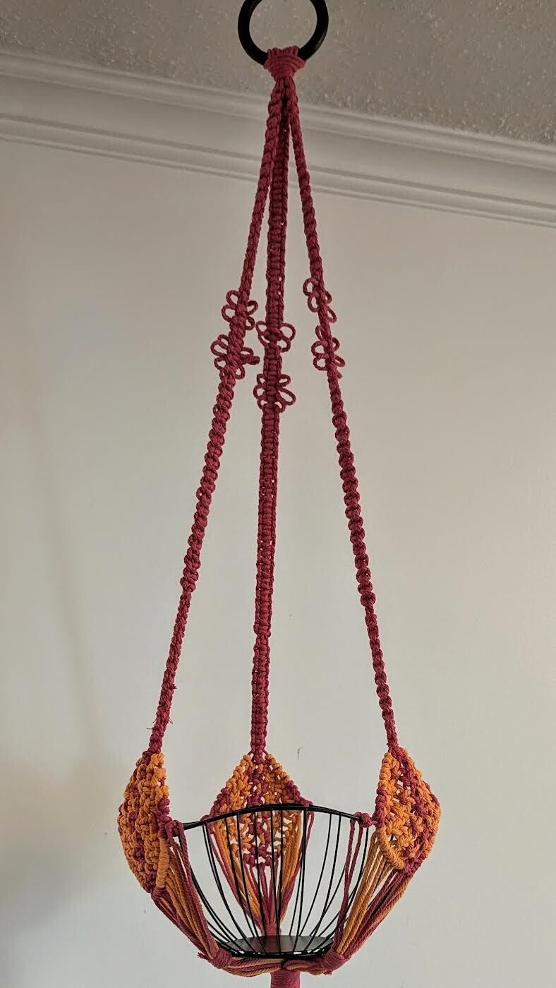 Pink and Orange Macrame Plant Holder with Attached Basket