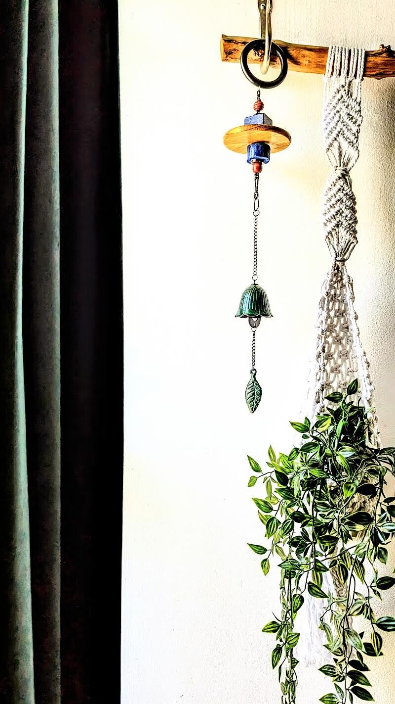 22" long with wooden accent adds to the beauty of the green bell. It features a delicate and will add to your plant display or just an interesting piece.